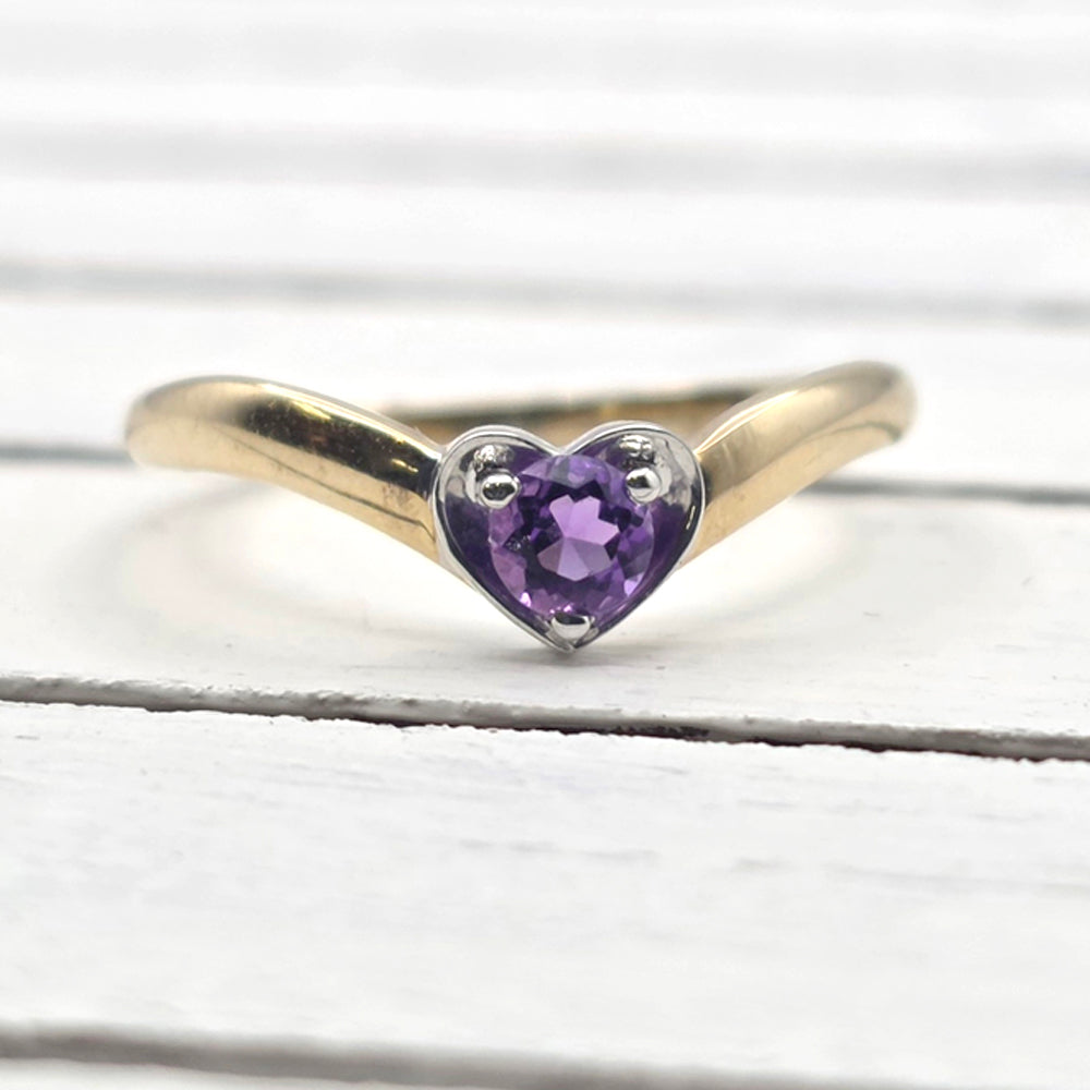 Indulge in the warmth of 10K yellow gold, providing the perfect setting for the captivating amethyst. This stackable ring is more than an accessory; it's a statement of quality and attention to detail. The V-shaped design adds a modern flair, creating a piece that seamlessly blends sophistication and individuality.