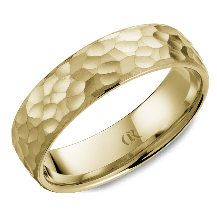 The distinctive frosted hammer finish adds a modern texture with artisanal character, beautifully enhancing the warm glow of yellow gold. Thoughtfully crafted with both style and comfort in mind, this ring blends classic craftsmanship with contemporary design, making it a meaningful choice for couples beginning their lifelong journey together.