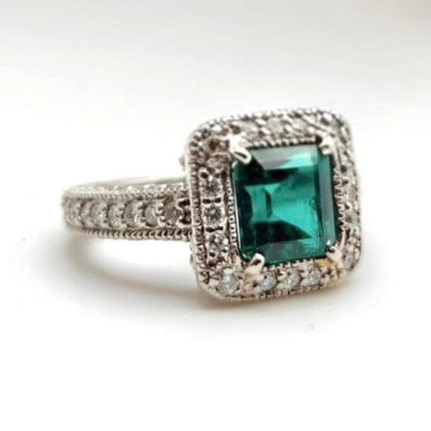 Introducing our exquisite Estate 14K white gold halo design ring, a true masterpiece that combines timeless elegance with modern allure. This enchanting ring features a dazzling 1.87 carat emerald, surrounded by a halo of 1.08 carat round brilliant diamonds that extend gracefully along the band.