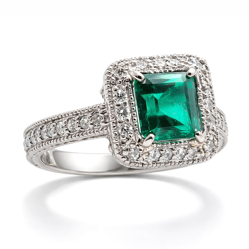 Meticulously crafted with a keen eye for detail, the diamonds boast VS clarity and GH colour, ensuring a stunning display of brilliance and radiance. The 14K white gold setting provides a perfect backdrop, enhancing the vibrancy of both the emerald and diamonds.