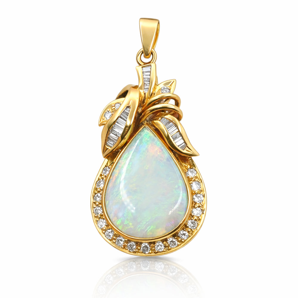 The opulent beauty of the pendant is further enhanced by carefully selected round brilliant diamonds totaling 0.44 carats and tapered baguette diamonds weighing 0.23 carats. These diamonds, of SI-I clarity, G-J colour, and exhibiting a good to very good cut, add a touch of brilliance to the opal's natural radiance.