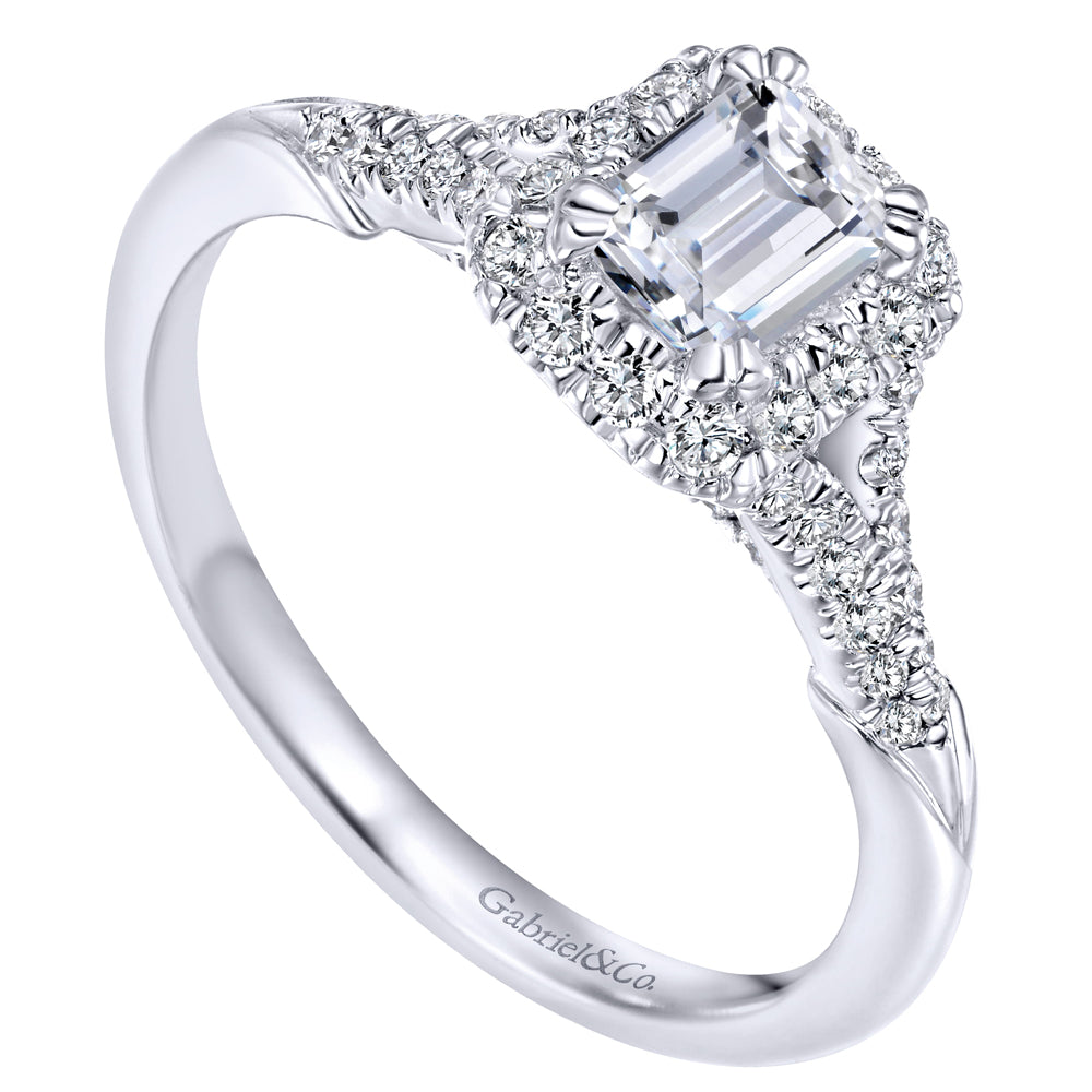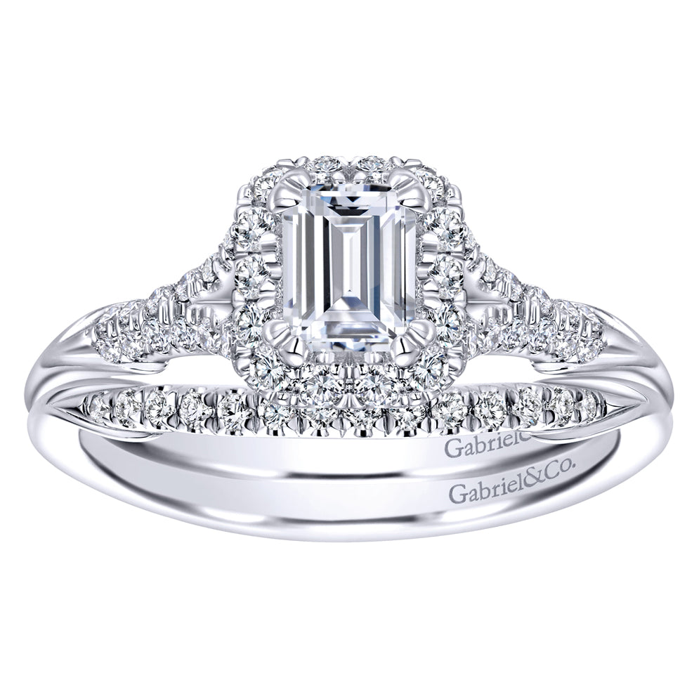 Classic elegance meets designer craftsmanship in this 14K white gold Gabriel & Co. halo engagement ring and matching wedding band set. The engagement ring features a beautifully balanced halo design set with a total of 1.15 carats of emerald-cut and round brilliant diamonds, creating exceptional sparkle and dimension.